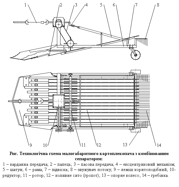 Запропонована (рис.) картоплезбиральна машина містить, скомпонований на рамі 6, підкопувальний робочий орган, виготовлений у вигляді пасивного коритоподібного лемеша 9, до пальців 2 якого шарнірно кріпиться вібраційне коливне сито 12, привод якого здійснюється ексцентриковим механізмом 4 через шатун 5. Над коливним ситом встановлено активний ротор 11, крутний момент до якого передається від ВВП трактора через карданну передачу 1, центральний редуктор 10 та ланцюгову передачу 3.