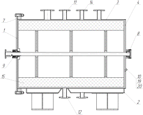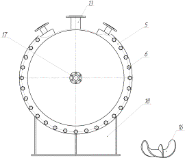 частині циліндричної обичайки 3 корпуса апарата розташовані штуцер подачі поживного середовища 11. В нижній