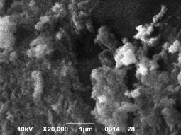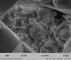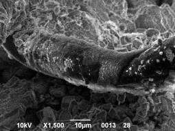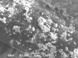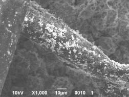 В данном гидроизоляционном составе, где в качестве вяжущего использовался клинкер с химическими добавками, силиконовая пленка на полиэфирном волокне (рис. 2) также служит подложкой для формирования кристаллической обоймы с целью не только защиты волокна от дальнейшего разрушения, но и создания прочного сцепления со всей структурой цементного камня (рис. 3, 4).
