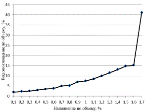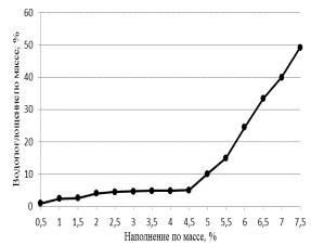 Рис. 6. Зависимость водопоглощения гидроизоляционного состава от его наполнения полиэфирным волокном