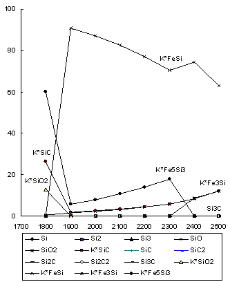 характеризуется образованием 4 элементами и соединениями: Fe, FeSi, Fe5Si3, Fe3Si, Si, Si2, Si3, CO, CO2 и т.д. Из рисунка 1, можно наблюдать, что степень