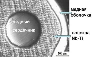 располагается промежуточный слой из волокон Nb-Ti, размещенных в медной матрице