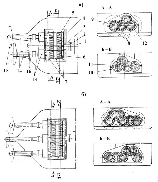 Рис. 1. Однодизельна пропульсивна установка з гвинтами, що перекривають один одного: а) – двовальна установка; б) – тривальна установка; 1 – дизельний двигун; 2 – з’єднувальна муфта; 3, 4, 5, 6 – відповідно двовінцеві шевронні зубчасті колеса головного двигуна, проміжне та гребних валів лівого і правого бортів; 7 – циліндричні ділянки зубчастих коліс; 8 – гідро-, статодинамічні підшипники; 9 – вкладиші підшипників; 10,11 – відповідно корпус та кришка зубчастого зачеплення; 12 – робочі канали підшипників; 13 – упорні підшипники; 14 – дейдвудні пристрої; 15 – гребні гвинти; 16 – гребні вали