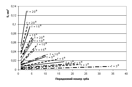 відповідно, зростає площа перерізу, витісненого кожним зубом. Кінці графіків