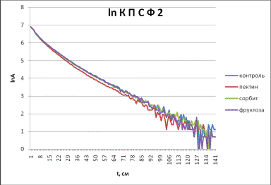 В трубку для измерения ЯМР помещали пробирку с равномерно распределенным образцом и сразу измеряли спин-спиновую релаксацию протонов Т2 в диапазоне 0,1-150 мс. Проводилось исследование водопоглотительной способности теста, в различных вариантах: после замеса, через 15 мин и через 30 мин после замеса. Исследовались по четыре образца: контроль, с добавлением пектина, сорбита и фруктозы в каждом варианте [2].