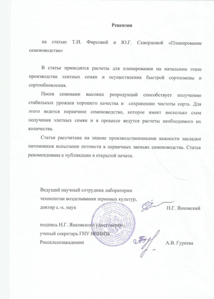 с.-х. наук Фирсова Т.И., н. с. Скворцова Ю.Г.