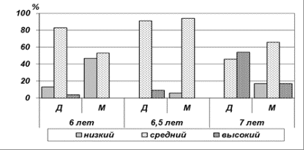 исследователями [4]. Так, у 47% мальчиков в 6 лет отмечался низкий, у 53% -