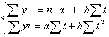 наименьших квадратов, используя линейную функцию у = a + bt, где a и b –