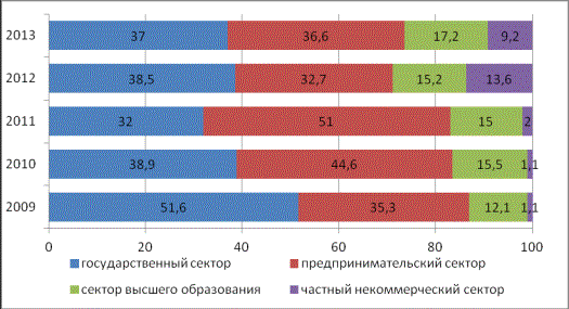 что доля государственного сектора в проведении НИОКР в 2013 году, являющаяся