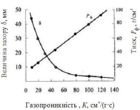 представлені залежності газового тиску в обсязі зазору δ від сумарної газопроникності форми при постійних параметрах технології