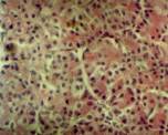 – зернистая дистрофия экзокриноцитов, окр. гем.-эозин., ув. ок. 7, об. 40.
