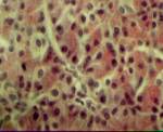 цитоплазмы и уплотнение кариоплазмы гепатоцитов, окр. гем.-эозин., ув. ок. 7,