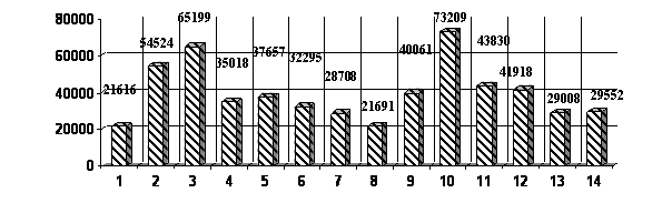 1 – с/х; 2 – рыболовство, рыбоводство; 3 – добыча полезных ископаемых; 4 – обрабатывающие пр-ва; 5 – пр-во и распределение электроэнергии, газа и воды; 6 – строительство; 7 – торговля; 8 – гостиницы и рестораны; 9 – транспорт и связь; 10 – финансовая деятельность; 11 – операции с недвижимым имуществом; 12 – госуправление; 13 – образование; 14 – здравоохранение