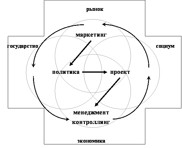 Таким образом образуется последовательность: маркетинг – политика – проект – менеджмент. Запараллелить процесс помогает контроллинг. Он связывает описанные компоненты технологии воедино. Предполагает одновременное использование инструментов из разных компонентов и имеет вид спирали (Рисунок 2).