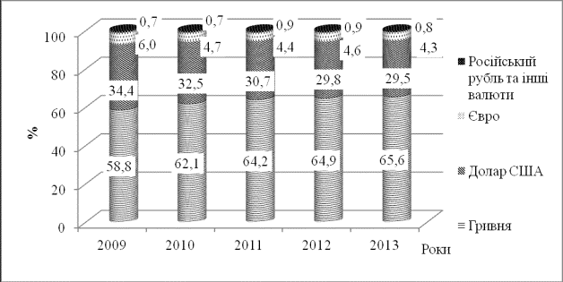 суб’єктам господарювання у розрізі валют протягом 2009-2013 рр.,% [5]