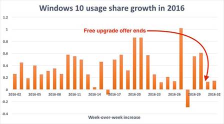 Популярність ОС Windows 10 (за тижнями станом на серпень 2016 р.)