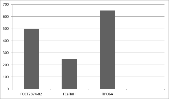 в пробе составляет 650 мг/дм3 (ПДК - 500 мг/дм3)мг/дм3,