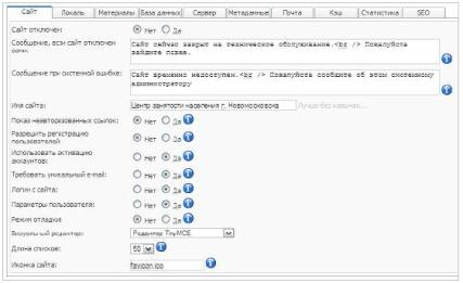 -«Сайт» – общие настройки работы сайта (имя, описание,