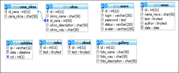 Таблица «okna» состоит из полей «id» - идентификационный номер соответствующей записи , «okno_name» - поле, в