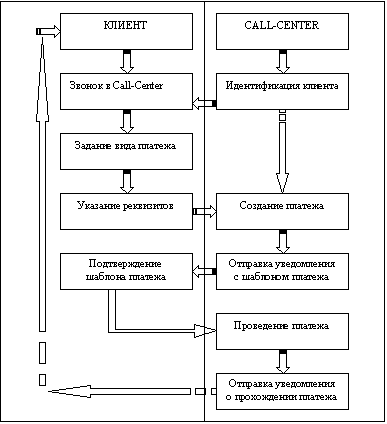 Звонок клиента в Call-центр Идентификация плательщика Заказ услуги Получение реквизитов для оплаты Выбор источника списания средств Ознакомление плательщика с шаблоном платежа Подтверждение платежа плательщиком СМС-уведомление о проведенных платежах