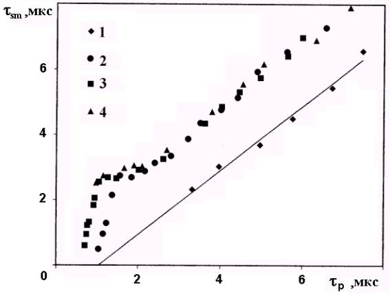 1. Зависимости времени нахождения образца в намагниченном состоянии tsm (1), времени перемагничивания образца tm (2) и времени задержки спада сигнала