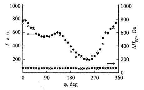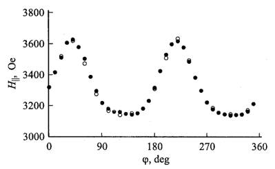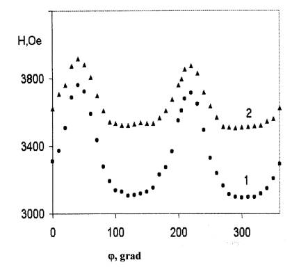 Видно, что резонансное поле в зависимости от φ изменяется от Hmin ≈ 3130 Э до Hmax ≈ 3630 Э, т.е. магнитная анизотропия в