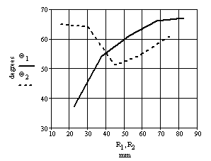 На рисунке 2 показаны зависимости угла максимального излучения двух групп МИ от радиуса экрана.