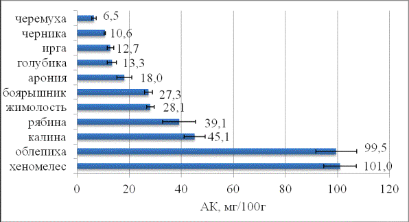 мг/100г) и хеномелес (среднее – 101,0 мг/100г; максимальное – 184,8 мг/100г).