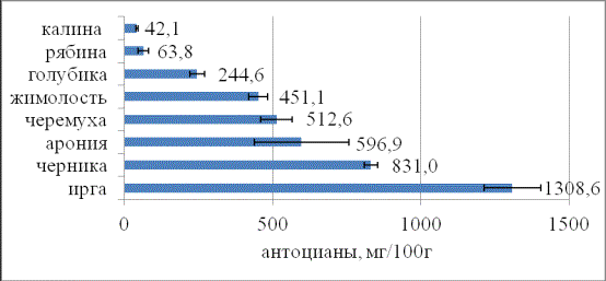антоцианов являются плоды аронии (до 765,6 мг/100г), черники (до 871,2