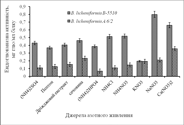 інших джерел азоту та становить 0,67 і 0,36 мг глю/мг білку для штамів B. licheniformis В-5510 та B. licheniformis A 6/2 відповідно.