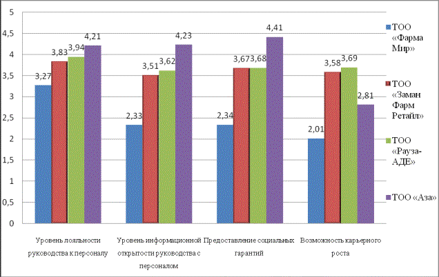 (4,90 балла), «уровень лояльности руководства к персоналу» (4,51 балла). Низкие