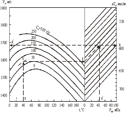 1.1 – Номограма для визначення інтервального часу у рідині ΔТр, та швидкості Vр при заданій мінералізації Св (кг/м3),