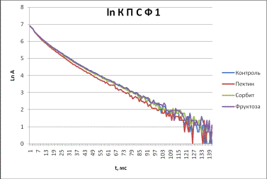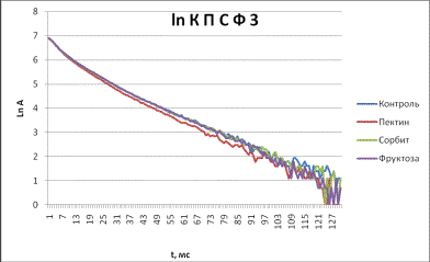 В трубку для измерения ЯМР помещали пробирку с равномерно распределенным образцом и сразу измеряли спин-спиновую релаксацию протонов Т2 в диапазоне 0,1-150 мс. Проводилось исследование водопоглотительной способности теста, в различных вариантах: после замеса, через 15 мин и через 30 мин после замеса. Исследовались по четыре образца: контроль, с добавлением пектина, сорбита и фруктозы в каждом варианте [2].