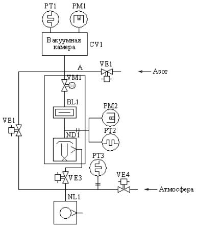 преобразователь манометрический термопарный; VE1- клапан КВУМ-25; VE2- клапан КВУМ-16; VE3- клапан КВУМ-40; BL1- затвор вакуумный