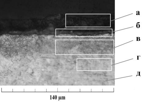 в – зона структурных изменений; г – зона без изменений; д – металл основы