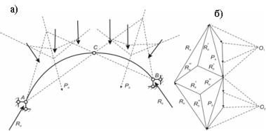 Для изучения напряженного состояния арки и для суждения о степени рациональности очертания ее оси весьма удобным оказывается использование многоугольника равнодействующих.