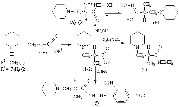 wide spectrum of action, we carried out synthesis of N1-(2,4-dinitrophenyl)hydrazide of α-methyl-β-(N-piperidyl)propane acid (5) at condensation of 2,4-dinitrophenylhydrazine with a methyl ester