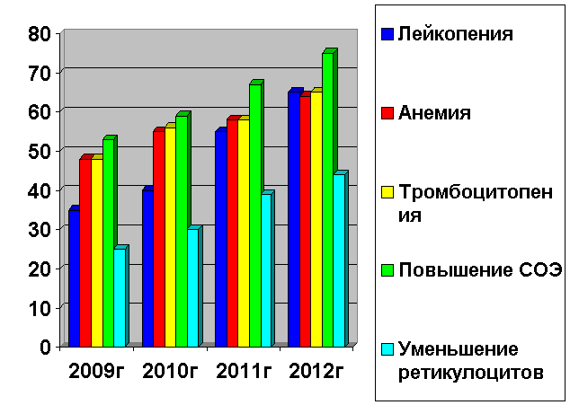 лейкопению,тромбоцитопению,снижение ретикулоцитов,повышение