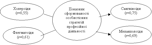 Мал. 2. Кореляційні зв’язки між типами темпераменту психологів та показником сформованості