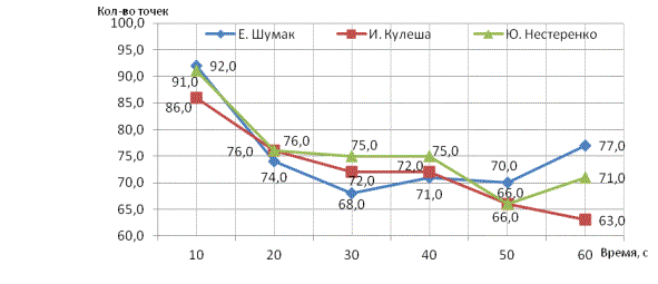высокий темп движений у Е. Шумак – 77,0 точек, он увеличивается по