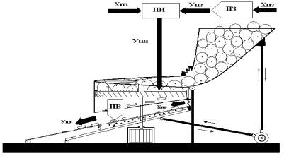 Рассматриваются модели технических систем, описывающие процессы, происходящие при подготовке плодов для сушки. Рассмотрим модель, обусловленную воздействием как внешней среды, так и внутренних процессов, происходящих в системе. На рис. 1 приведена модель функционирования измельчителя плодов. В упрощенном виде процесс его функционирования включает в себя три взаимосвязанных блока: загрузка измельчителя (ПЗ); измельчение (ПИ) и выпуск измельченного продукта (ПВ). В модели измельчителя внешние и внутренние воздействия характеризуют следующие вектор-функции: Хпз – условия (средства) загрузки; Yпз – влияние параметров загрузки на измельчение и выпуск готового продукта; Хпи – влияние параметров измельчителя на процесс измельчения, влияние параметров измельчаемого материала на процесс измельчения; Yпи – влияние параметров измельчения на выпуск готового продукта; Хпв – параметры измельчителя и свойства измельченного продукта; Yпв – влияние параметров выпуска на энергоемкость процесса измельчения.