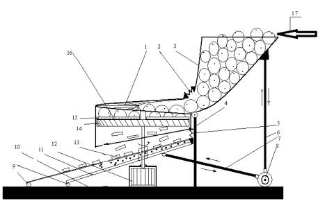 5- пружина; 6,7- вибростойки; 8- привод вибростоек;9- колеса вибросетки и виброполотна для семян и остаточного сока; 10- рама; 11- виброполотно для семян и остаточного сока;12- привод диска;13 - вибросетка для измельченных плодов; 14- диск;15- режущии нож; 16-валик регулирующий толщину стружки; 17- транспортер;