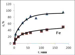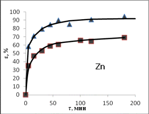 уравнениям, для предельного извлечения в раствор цинка 20% р-ром HCl при 363K потребуется около 80 мин, железа и