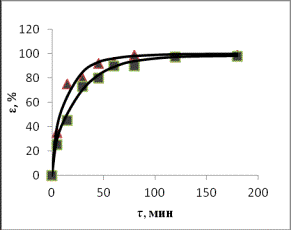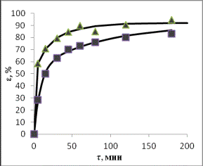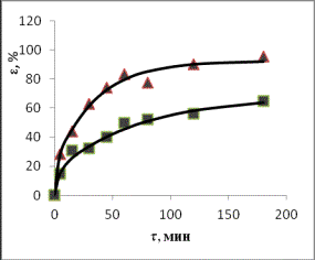 проведены два опыта при различных температурах Т1=353K и Т2=323K (концентрация 20% HCl, Ж:Т=10). Полученные зависимости извлечения