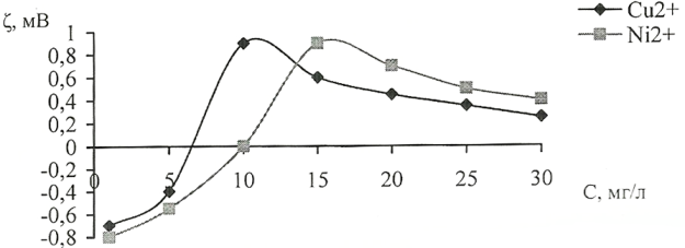 ионов меди, 98,9 % для ионов никеля). Характер изменения ζ-потенциала