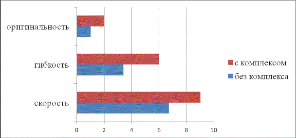 гибкость, оригинальность у испытуемых обеих групп представлены в таблице 1 и на