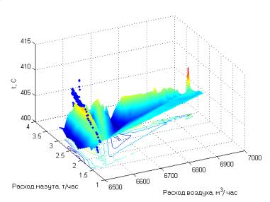 Расчетная зависимость температуры топочных газов от подачи топлива и воздуха