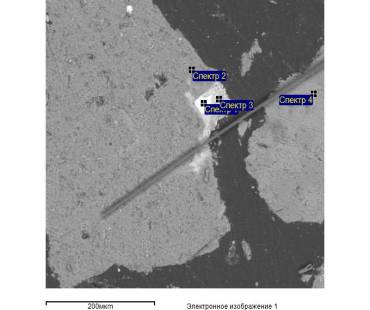 спектр 1: О-2,57%, S-22,16%, Cu-75,27%; спектр 2: O-48,85%, Na-7,70%, Al-10,17%,