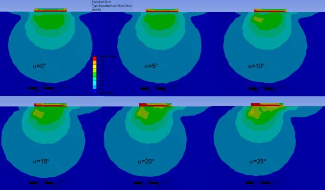 Як видно з рисунка 2, зміна кута a прикладання сили не впливає на розмір напруженої зони в глибині напівпростору.