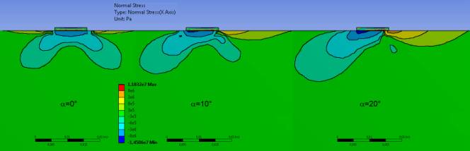 напруження зростають за величиною при збільшенні кута a. Також на частині поверхні напівпростору, яка протилежна до напрямку дії